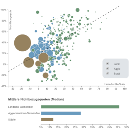 Für das Zentrum Soziale Sicherheit der Berner Fachhochschule hat die Forschungsstelle Digitale Nachhaltigkeit die Nichtbezugsquote bei der Sozialhilfe in Städten und Gemeinden gemäss ihrer politischen Lage auf der Links/Rechts-Skala visualisiert: