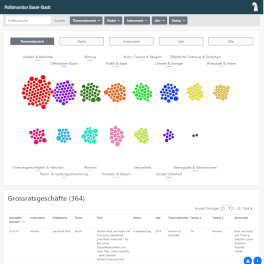 Der Politmonitor beruht auf Daten der Kantons- und Stadtentwicklung des Präsidialdepartements Basel-Stadt und wurde von der Forschungsstelle Digitale Nachhaltigkeit im Rahmen des OGD-Pilotprojekts der Staatskanzlei Basel-Stadt erarbeitet. Die App zeigt vom Grossen Rat per Mehrheitsbeschluss an den Regierungsrat des Kantons Basel-Stadt überwiesene Geschäfte (Petitionen, Anzüge, Motionen) sowie zustandegekommene kantonale Volksinitiativen.