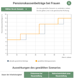 Im Rahmen des Projekts «Arbeitsmarkt 45+» berechnete die Berner Fachhochschule die Auswirkungen von altersabgestuften Pensionskassenbeiträgen auf Löhne und Arbeitslosigkeit. Dies tat sie anhand der BVG-Revision 2005 und der darin enthaltenen Beitragssenkung für Frauen. Die Forschungsstelle Digitale Nachhaltigkeit hat dafür eine interaktive Visualisierung erstellt: