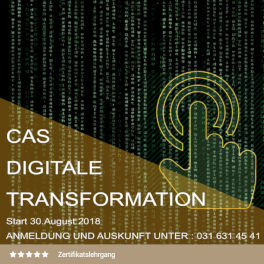 Im CAS Digitale Transformation der Universität Bern übernimmt Matthias Stürmer die Verantwortung über das Modul "Technologische Bausteine der digitalen Transformation". Dieses beinhaltet: Software-Trends, Data Science, Smart Cities, Internet of Things, Bitcoin/Blockchain und digitale Nachhaltigkeit.