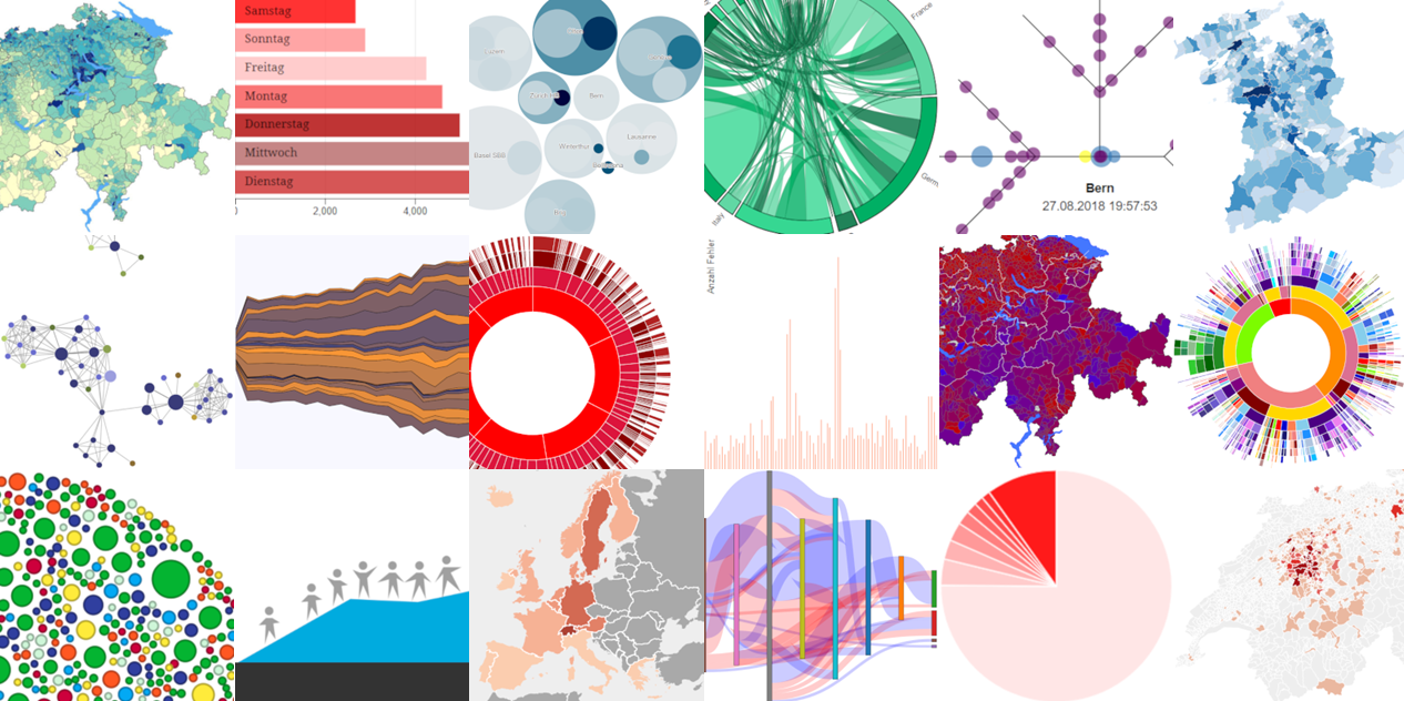 Um selber die technischen Fähigkeiten für die Entwicklung von interaktiven Datenvisualisierungen zu erlernen, erhielten die Studierenden in der Übung eine Einführung in die Webprogrammierung mit HTML, CSS, SVG, JavaScript und D3.js – Programmiervorkenntnisse wurden nicht vorausgesetzt. Im Rahmen dieser Übungen realisierten die Studierenden in Zweierteams oder alleine mit realen Datensätzen eine eigene Open Data Applikation. Beispiele von solchen interaktiven Datenvisualisierungen aus vergangenen Jahren sind im Open Data Show Room einsehbar.